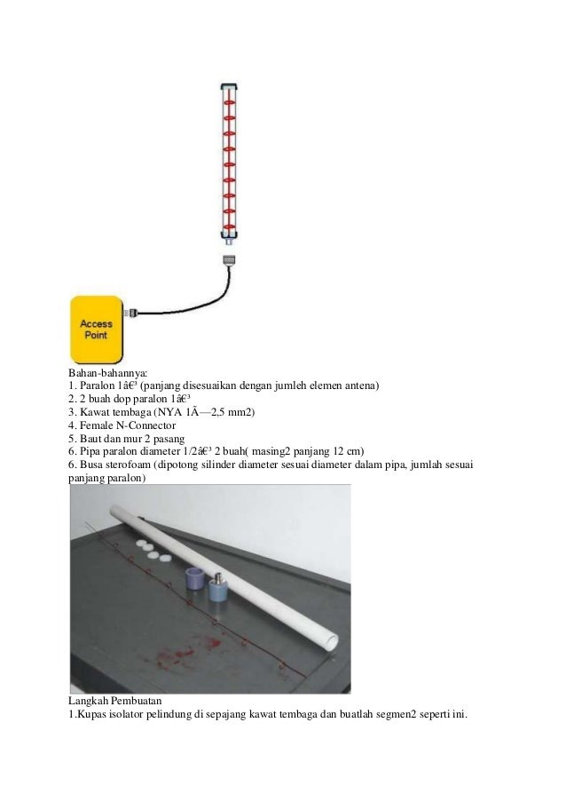 - 2. Bahan-bahannya:1. Paralon 1″ (panjang disesuaikan dengan jumleh elemen antena)2. 2 buah dop paralon 1″3. Kawat tembaga (NYA 1×2,5 mm2)4. Female N-Connector5. Baut dan mur 2 pasang6. Pipa paralon diameter 1/2″ 2 buah( masing2 panjang 12 cm)6. Busa sterofoam (dipotong silinder diameter sesuai diameter dalam pipa, jumlah sesuaipanjang paralon)Langkah Pembuatan1.Kupas isolator pelindung di sepajang kawat tembaga dan buatlah segmen2 seperti ini.