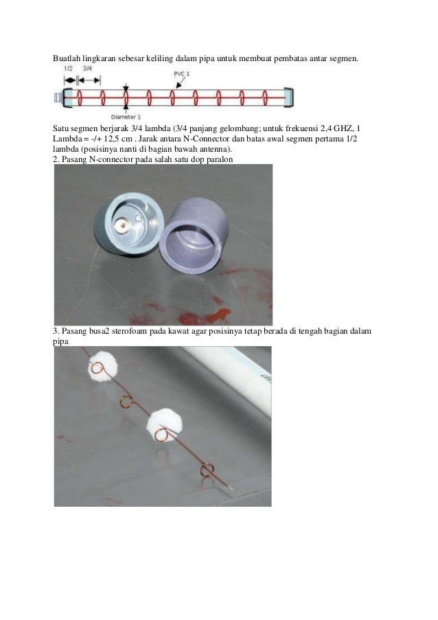 - 3. Buatlah lingkaran sebesar keliling dalam pipa untuk membuat pembatas antar segmen.Satu segmen berjarak 3/4 lambda (3/4 panjang gelombang; untuk frekuensi 2,4 GHZ, 1Lambda = -/+ 12,5 cm . Jarak antara N-Connector dan batas awal segmen pertama 1/2lambda (posisinya nanti di bagian bawah antenna).2. Pasang N-connector pada salah satu dop paralon3. Pasang busa2 sterofoam pada kawat agar posisinya tetap berada di tengah bagian dalampipa