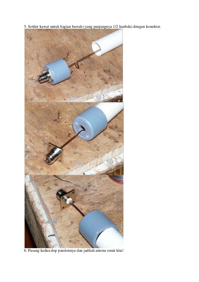 - 5. 5. Solder kawat untuk bagian bawah (yang panjangnya 1/2 lambda) dengan konektor.6. Pasang kedua dop paralonnya dan jadilah antena omni kita!