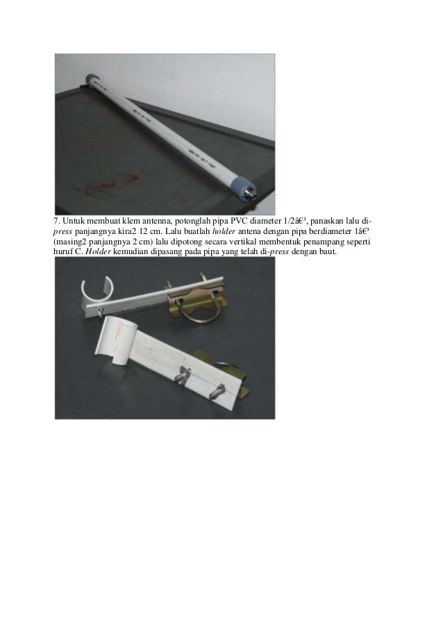 - 6. 7. Untuk membuat klem antenna, potonglah pipa PVC diameter 1/2″, panaskan lalu di-press panjangnya kira2 12 cm. Lalu buatlah holder antena dengan pipa berdiameter 1″(masing2 panjangnya 2 cm) lalu dipotong secara vertikal membentuk penampang sepertihuruf C. Holder kemudian dipasang pada pipa yang telah di-press dengan baut.
